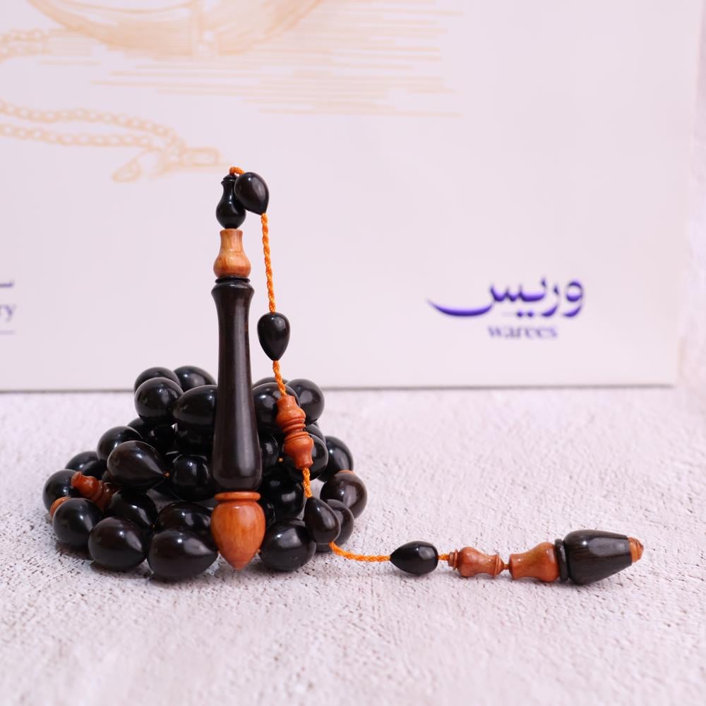 تجسد هذه السبحة من "وريس" روح الأصالة في أبهى صورها، بتصميم راقٍ يجمع بين خشب الأبانوس الأسود الكثيف ولمسات متقنة من خشب وحيد القرن النادر، في تعشيق أنيق يُبرز جمال التباين بين اللونين.