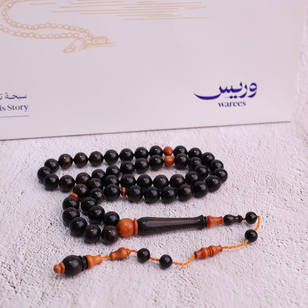تجسد هذه السبحة من "وريس" روح الأصالة في أبهى صورها، بتصميم راقٍ يجمع بين خشب الأبانوس الأسود الكثيف ولمسات متقنة من خشب وحيد القرن النادر، في تعشيق أنيق يُبرز جمال التباين بين اللونين.