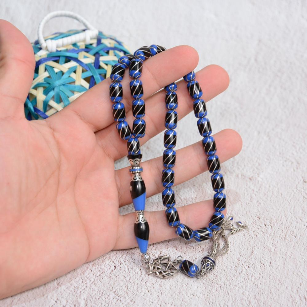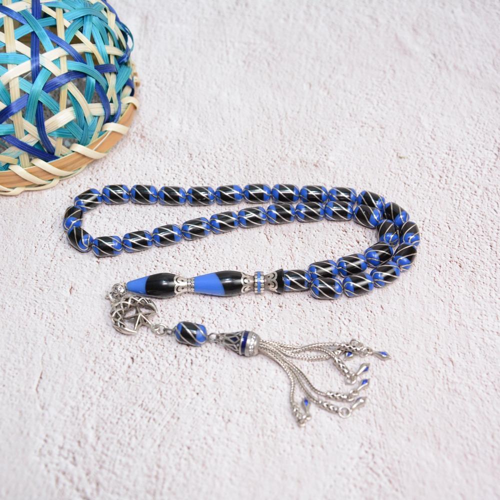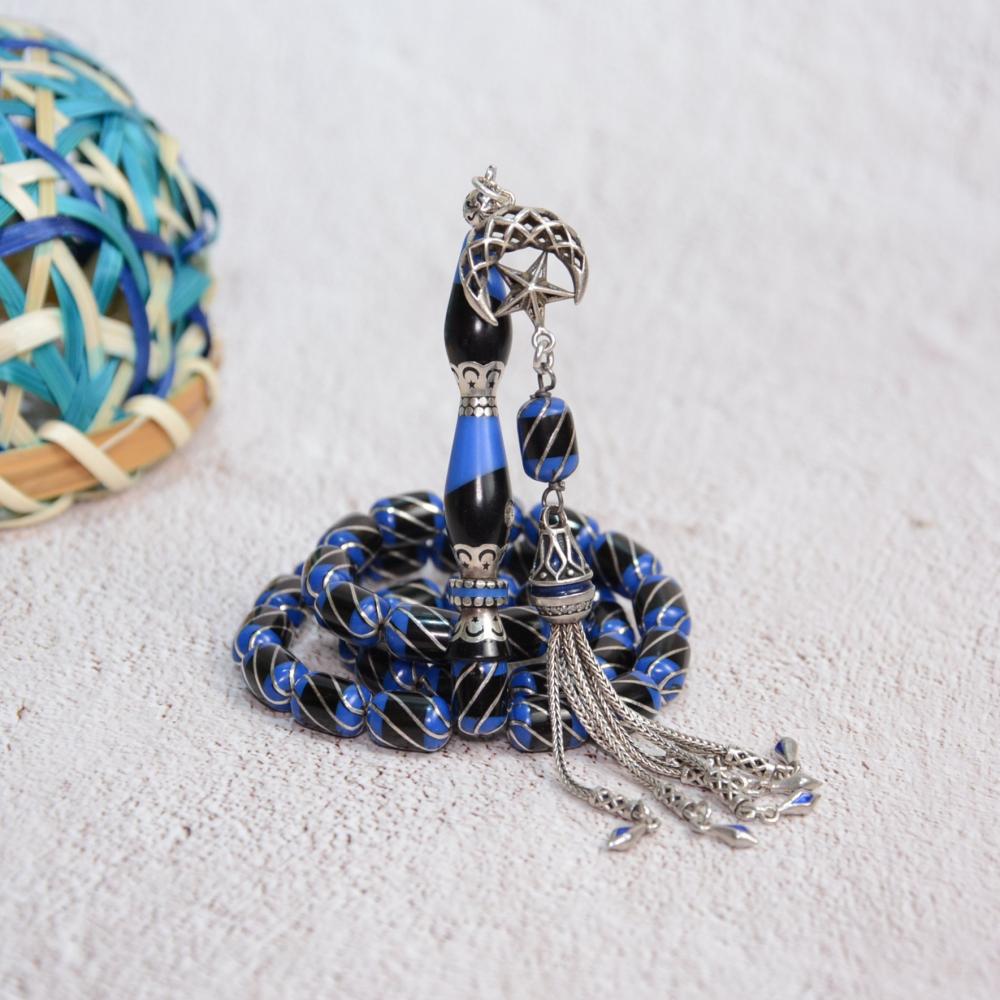 سبحة فاخرة ومميزة من حجر اولتو النادر مطعم بالكتالين الأزرق والفضة عيار ١٠٠٠
