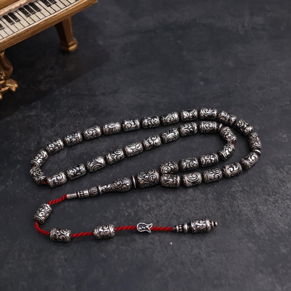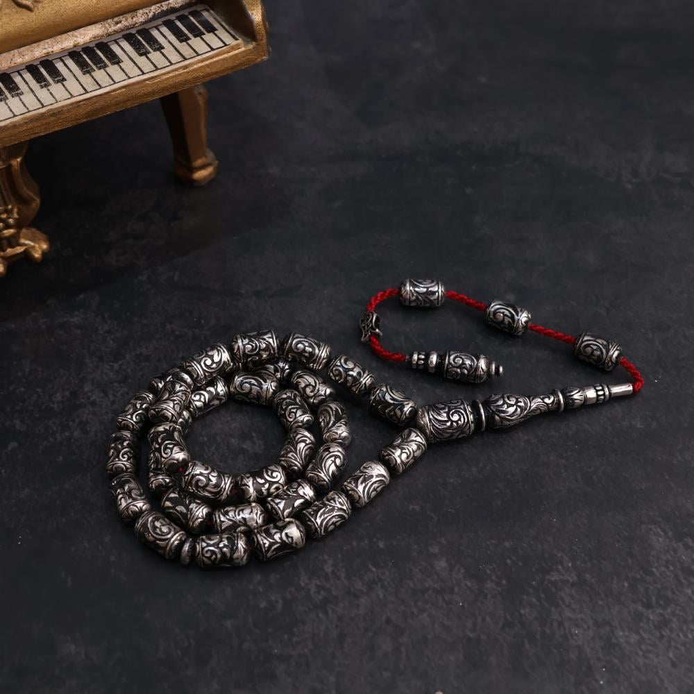 سبحة من الفضة النقية عيار 925 منقوشة يدويًا بنقوش دقيقة تنبض بالفخامة والتفاصيل الراقية، تجتمع فيها الأصالة مع الإتقان لتكوّن عملًا فنيًا يليق بالذوّاقين ومحبي التفرّد.