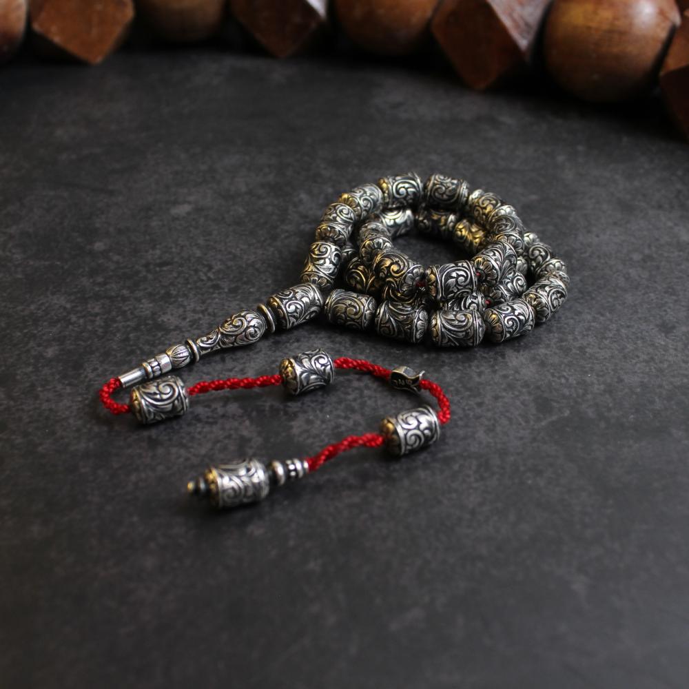 سبحة من الفضة النقية عيار 925 منقوشة يدويًا بنقوش دقيقة تنبض بالفخامة والتفاصيل الراقية، تجتمع فيها الأصالة مع الإتقان لتكوّن عملًا فنيًا يليق بالذوّاقين ومحبي التفرّد.