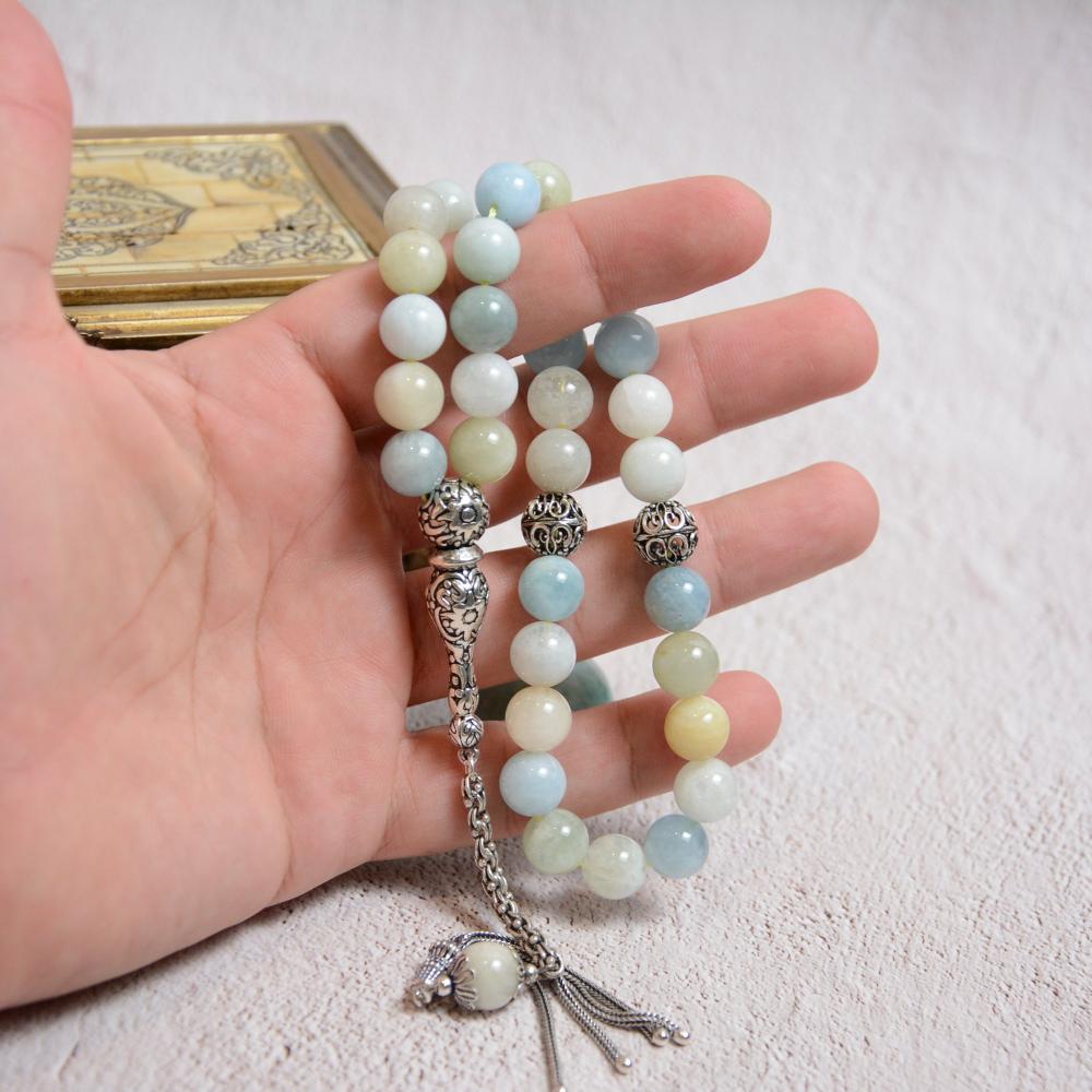 سبحة مميزة وسهلة الحمل والاستخدام اليومي من حجر اكوامارين المذهل مع شاهد وتمليكة من الفضة عيار ٩٢٥