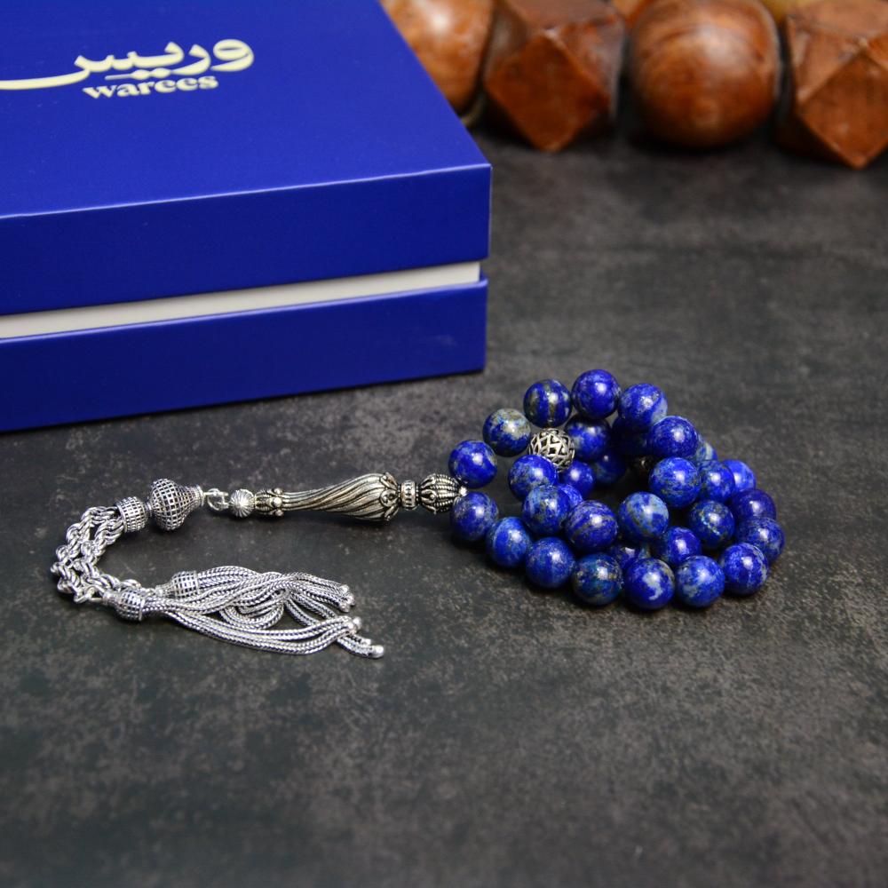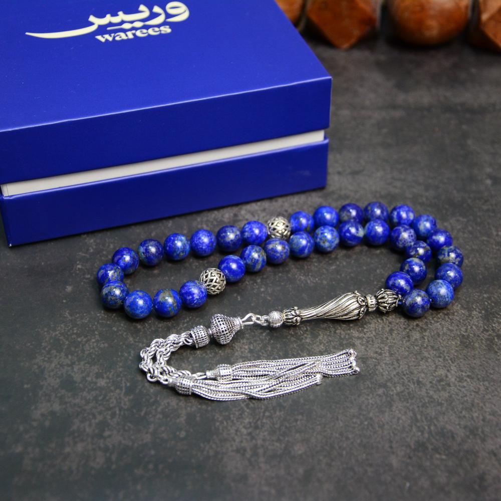 سبحة مميزة وسهلة الحمل والاستخدام اليومي من حجر اللازورد الكريم مع شاهد وكركوشة من الفضة عيار 925