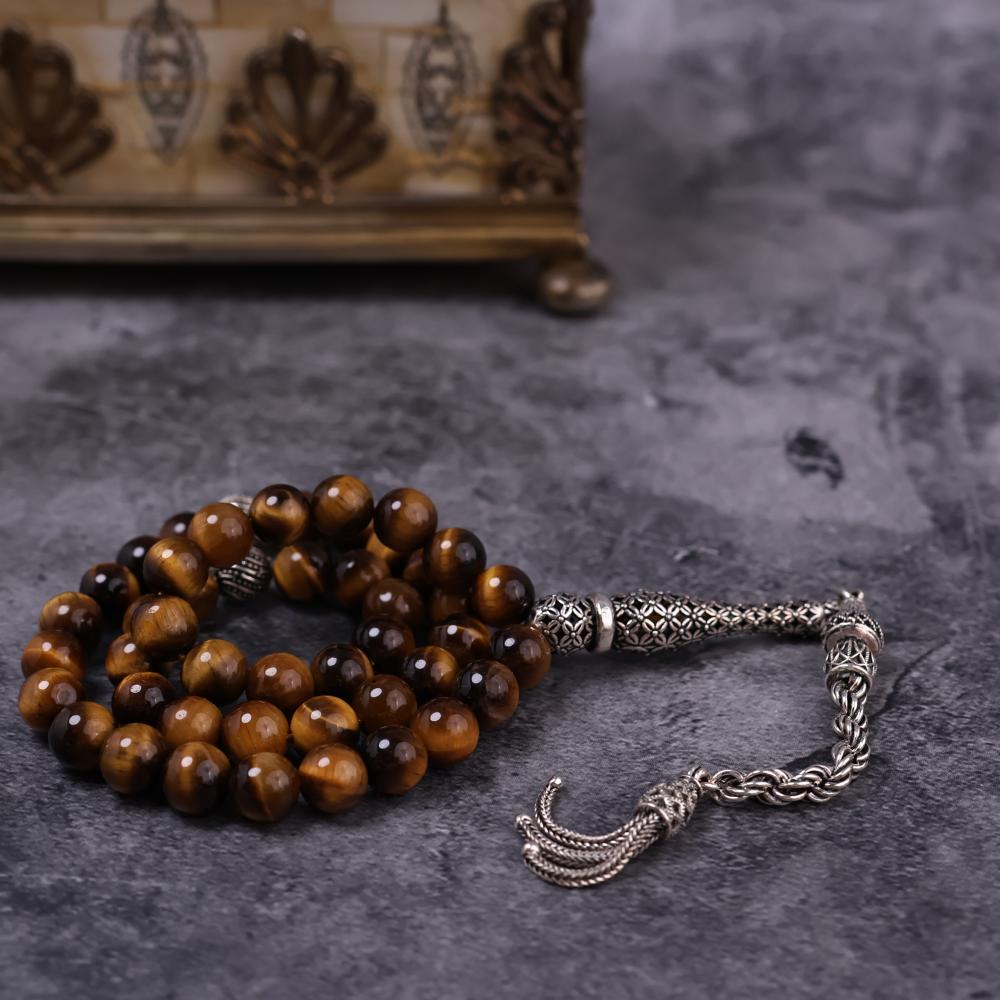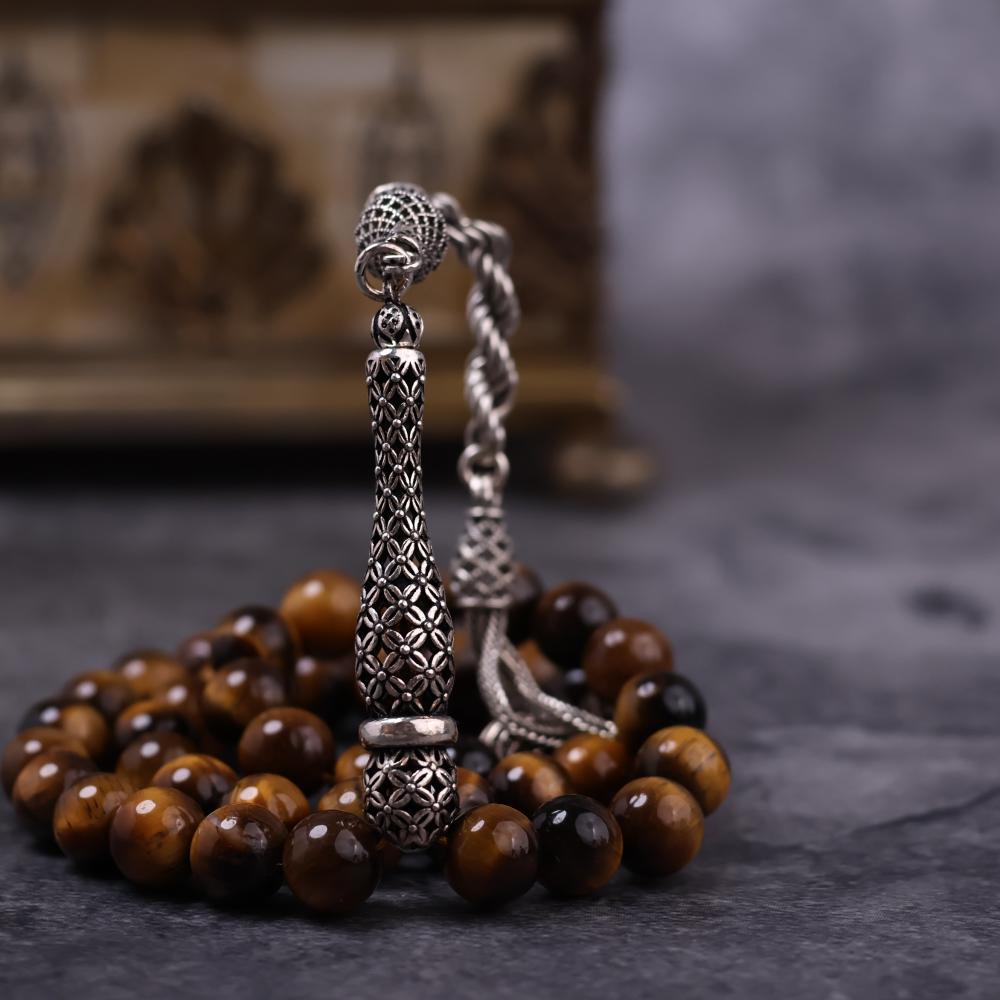 سبحة فاخرة مصنوعة من حجر عين النمر المعروف بتدرجاته الذهبية والبنية التي تعكس لمعاناً أخّاذاً مع كل حركة. تكتمل بجمال شاهدٍ من الفضة المزخرفة لتمنحها مزيجاً من الفخامة والهيبة.