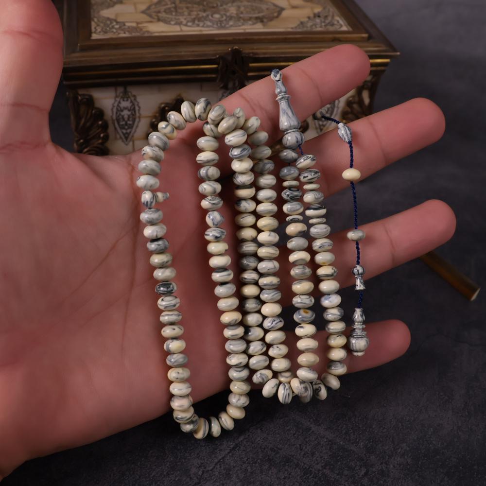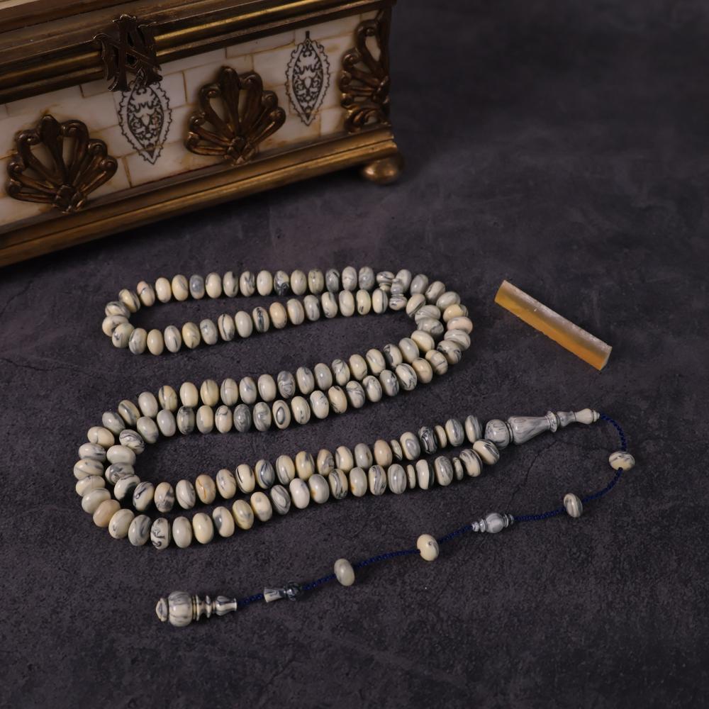سبحة نادرة مصنوعة من مقابض أبواب ونوافذ روسية قديمة بخامة البكلايت الأصلي القديم، التي تعود لعقود طويلة وتُعرف باسم تشيرنوبل. خامة عريقة مرت بظروف وتاريخ يجعلها تحمل قيمة تراثية خاصة، بلونها العاجي الممزوج بعروق رمادية أنيقة تمنحها حضورًا فريدًا لا يتكرر.