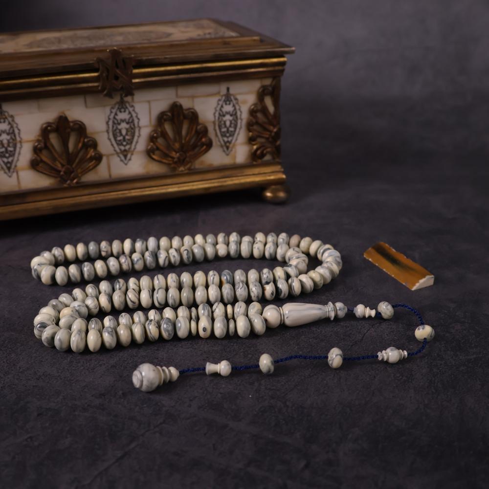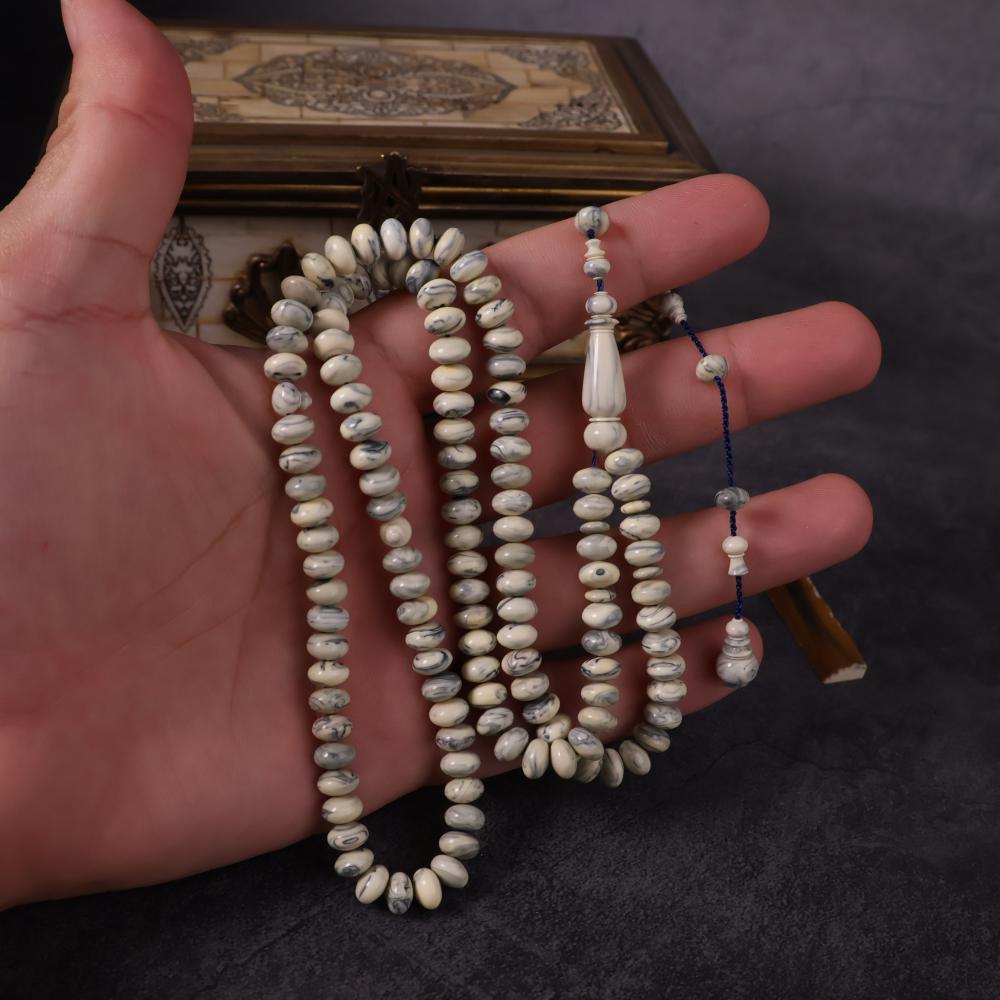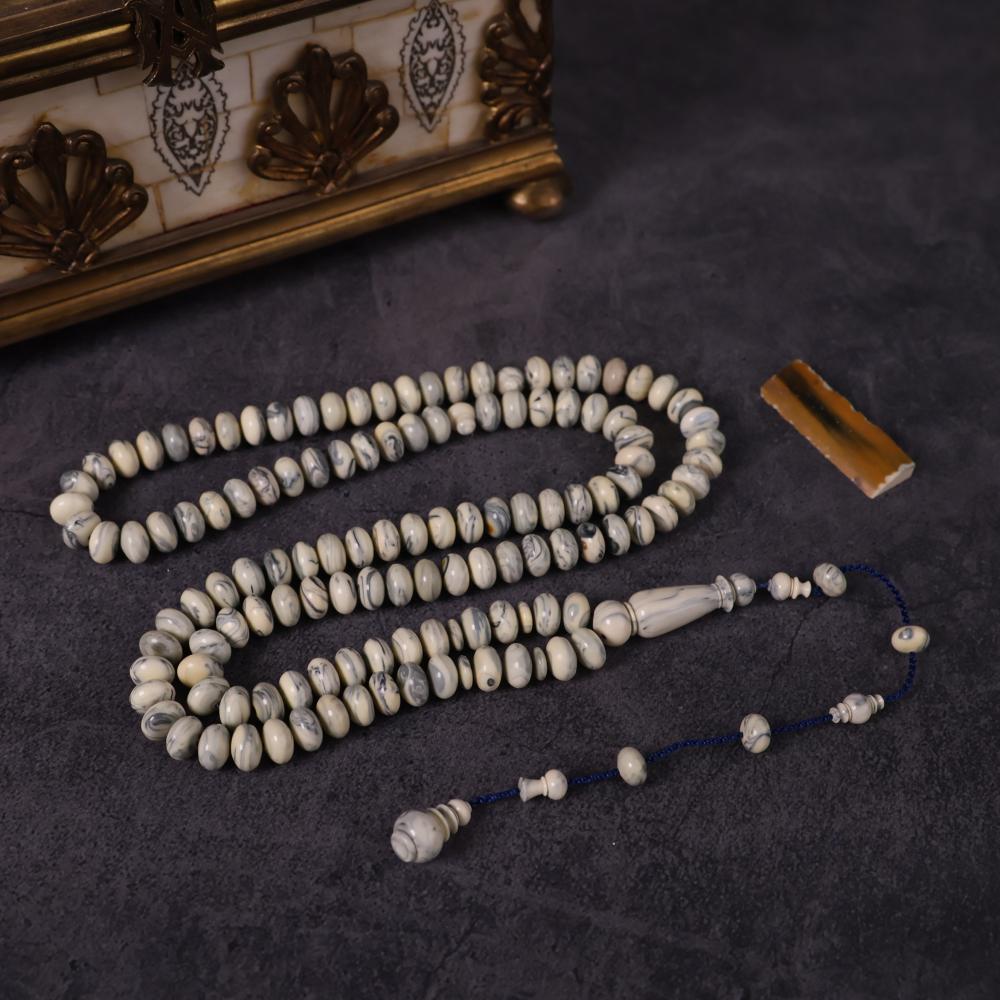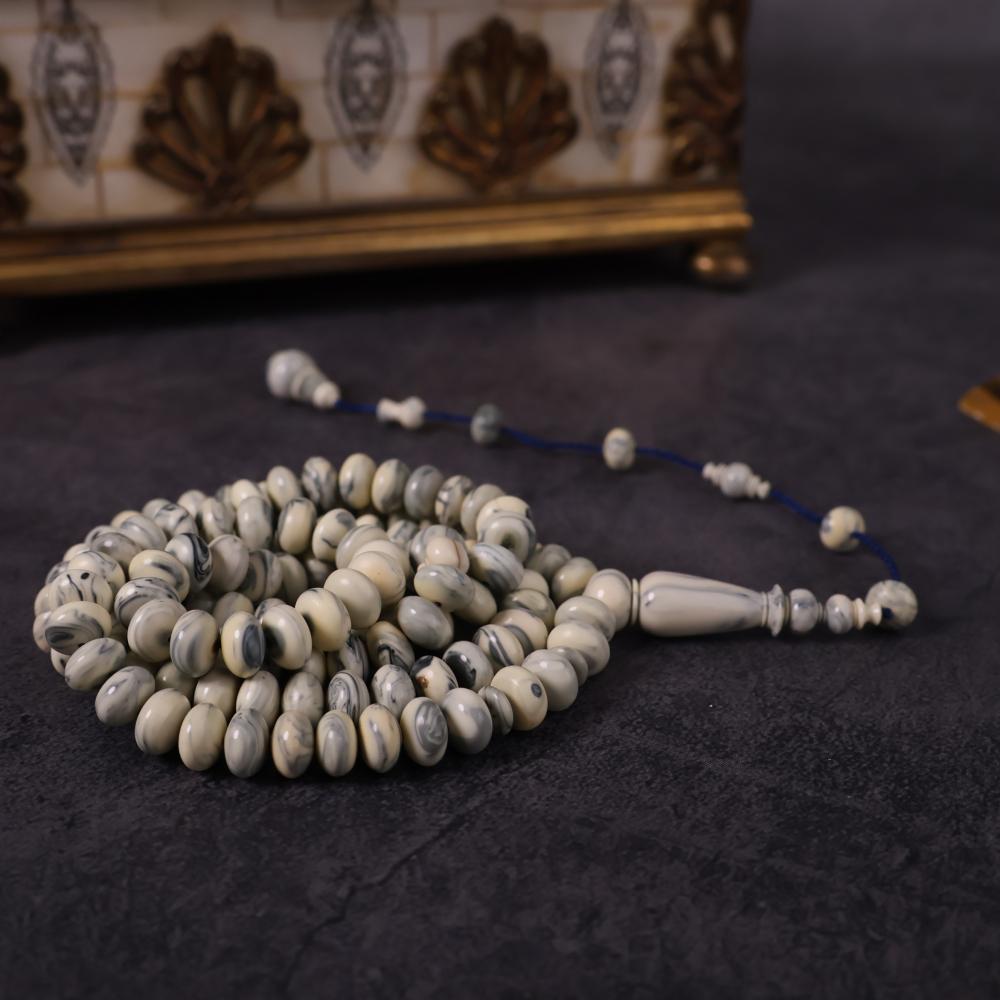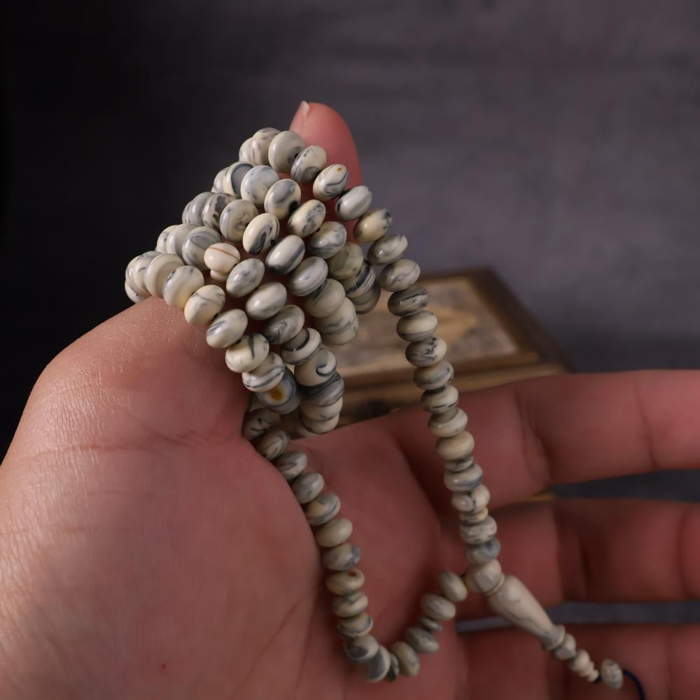 سبحة نادرة مصنوعة من مقابض أبواب ونوافذ روسية قديمة بخامة البكلايت الأصلي القديم، التي تعود لعقود طويلة وتُعرف باسم تشيرنوبل. خامة عريقة مرت بظروف وتاريخ يجعلها تحمل قيمة تراثية خاصة، بلونها العاجي الممزوج بعروق رمادية أنيقة تمنحها حضورًا فريدًا لا يتكرر.
