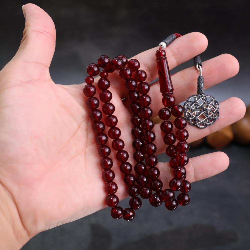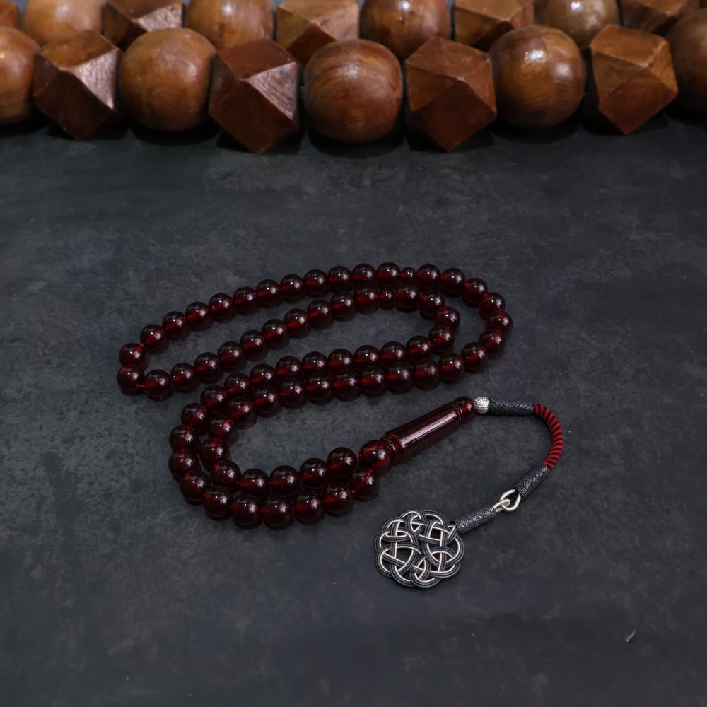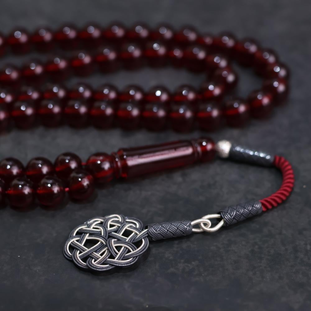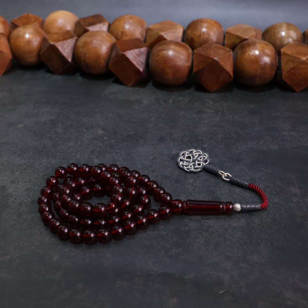 مسبحة زعفراني من خامة ايرانية راقية ذات رائحة الزعفران تظهر عند الاستخدام وذات لون جذاب و ملمس حريري ناعم ولإضفاء لمسة من الفخامة والجمال، تزين هذه المسبحة طرابزونة من الفضة عيار ٩٢٥
