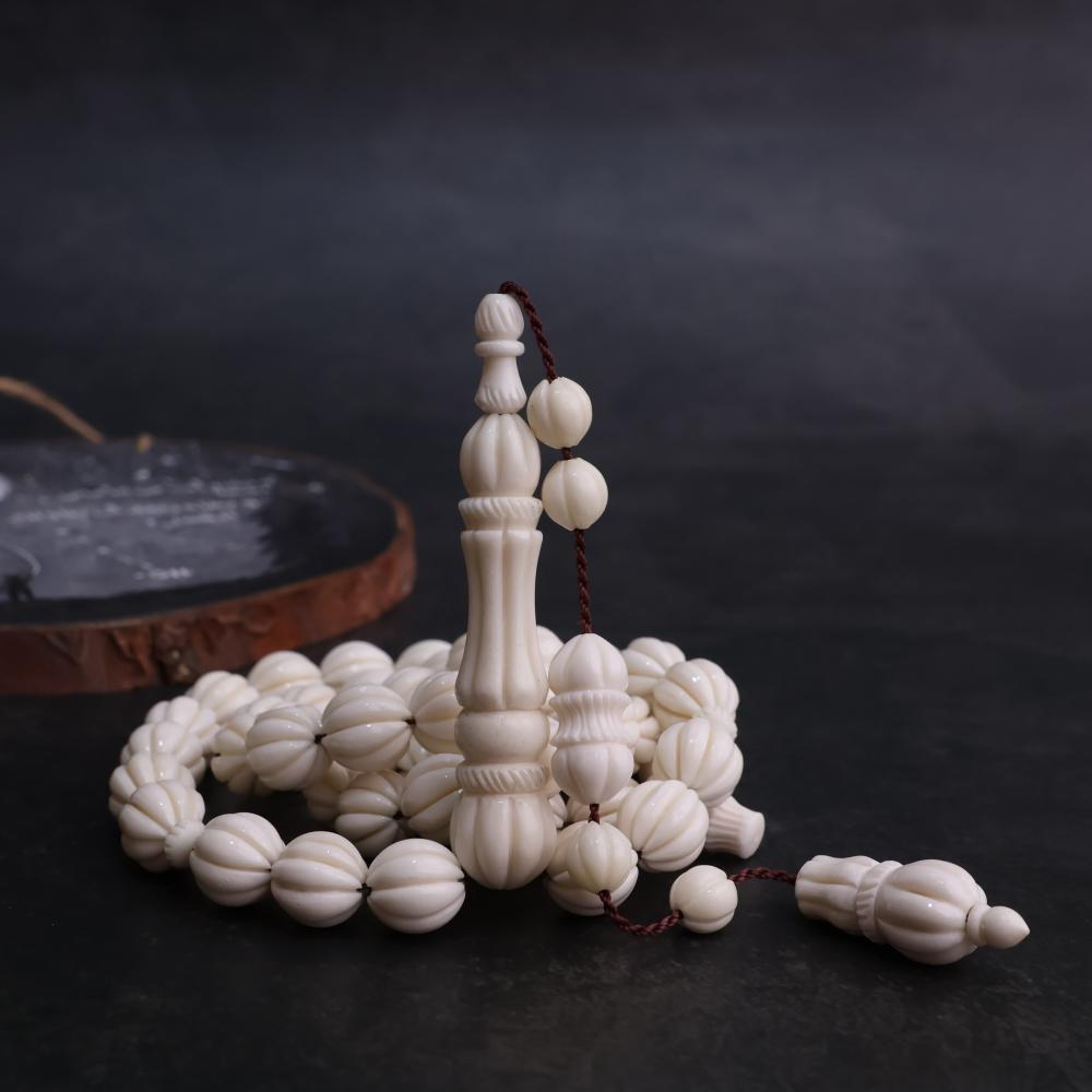 سبحة راقية مصنوعة من عظم الجمل الطبيعي، مميزة بنقش طولي أنيق يمنح كل خرزة لمسة فنية متفردة.