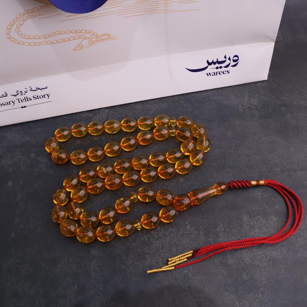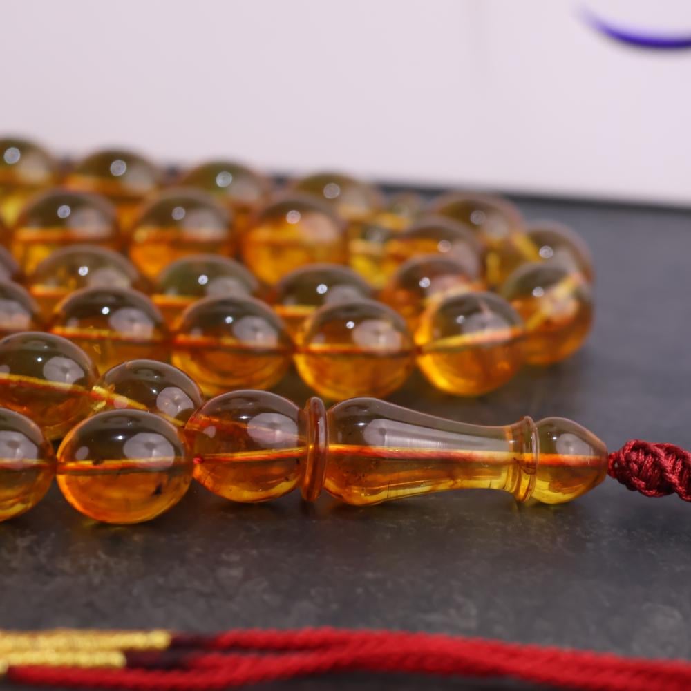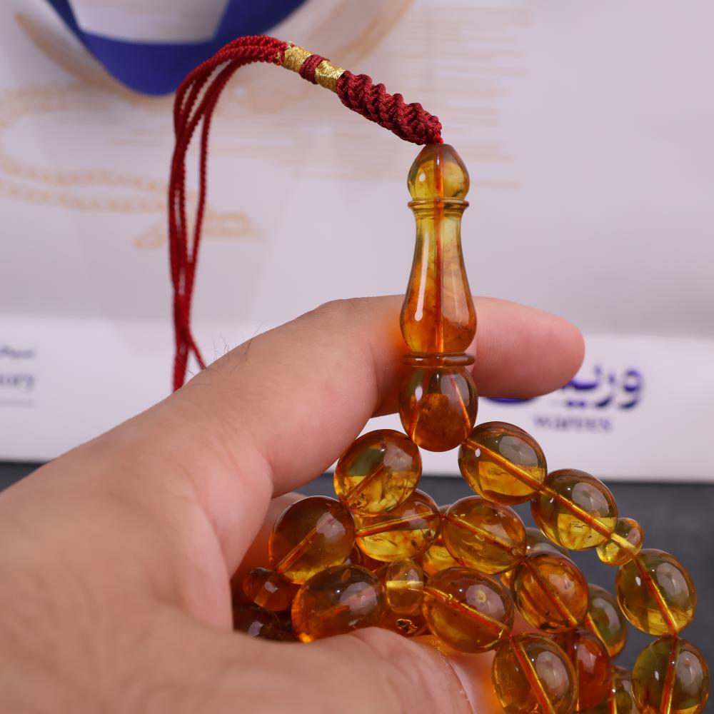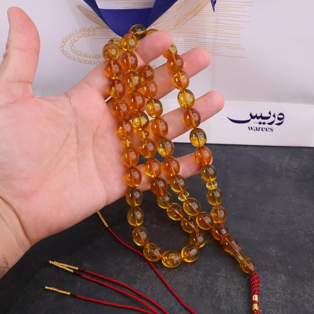 سبحة جميلة جدا وملفتة للنظر بطبيعة الخرز الذي يحتوي على شوائب طبيعية داخل الكهرمان.