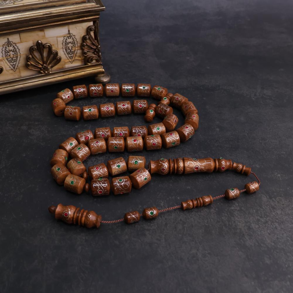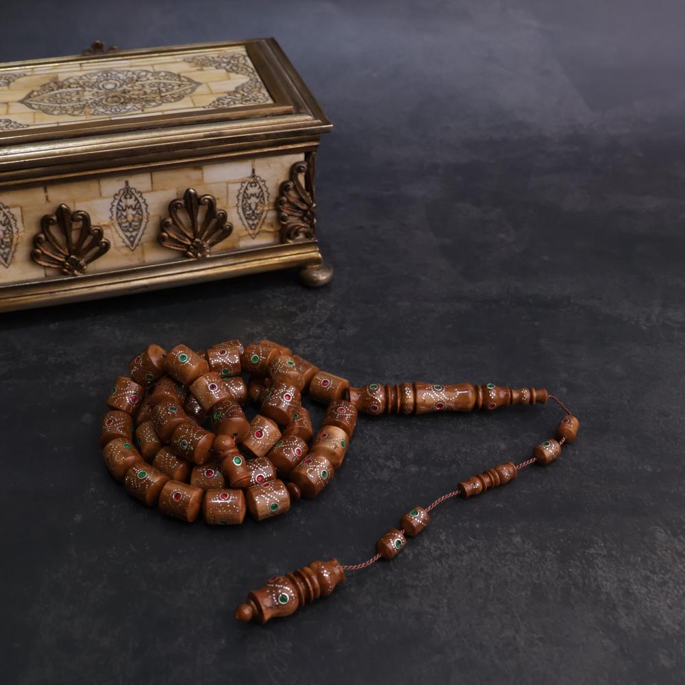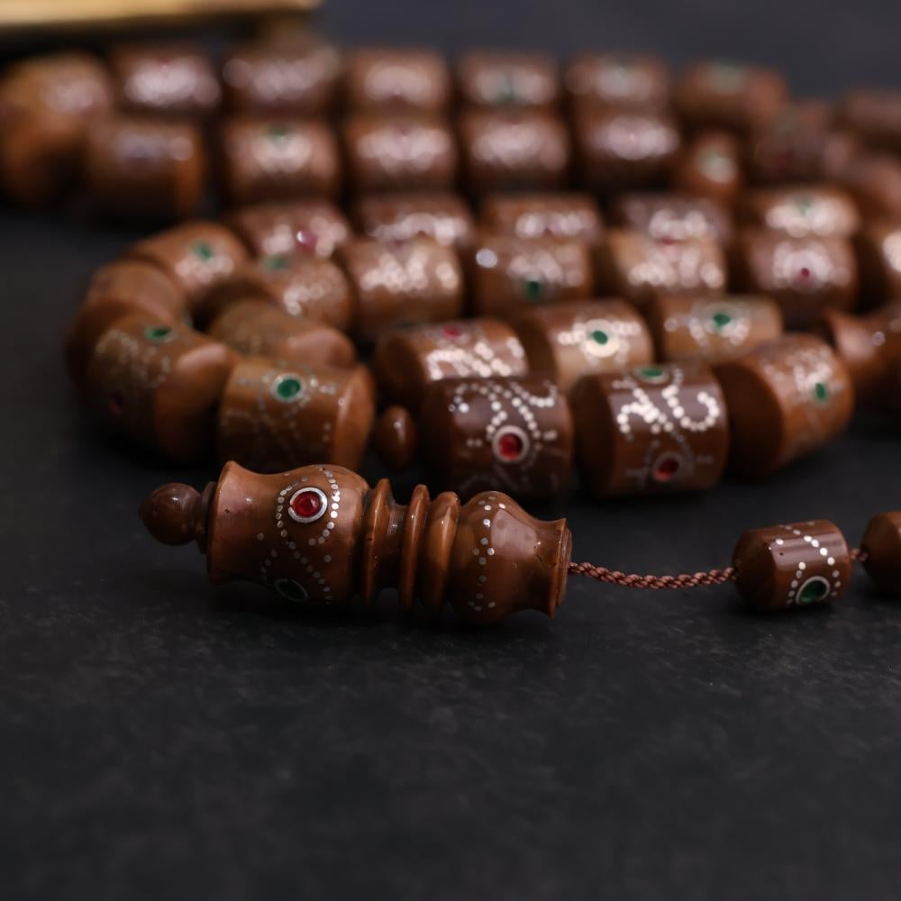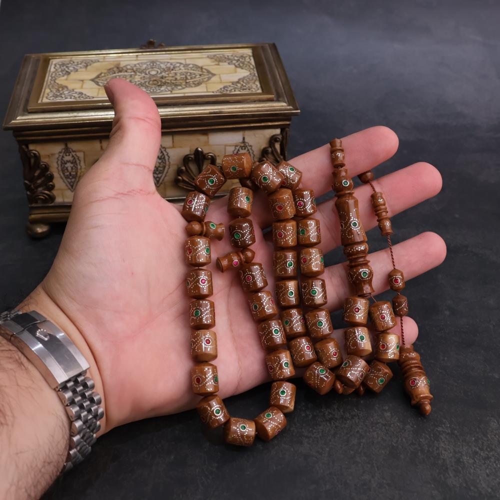 بناء على طلبكم عاد لكم المسباح الفاخر والمصنوع بشكل يدوي، تحفة جميلة من خشب الكوك الأصلي بقصة برميلي راهي ، لها ملمس ناعم وصوت رنّان، مرصعه بالفضة الخالصة.