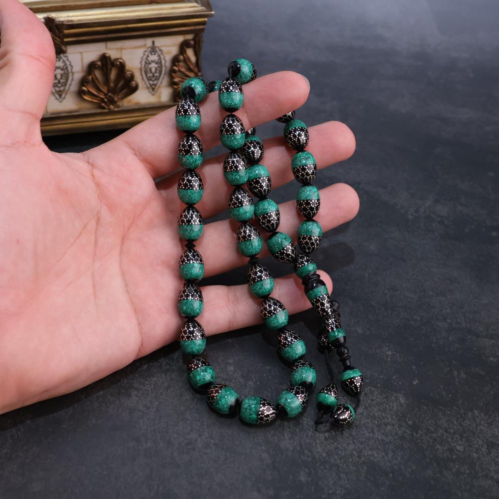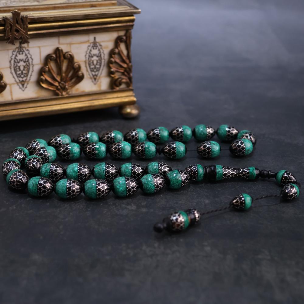 سبحة كوك مطعم بالفضة عيار ١٠٠٠ وكسر من حجر الملاكايت الأخصر المميز