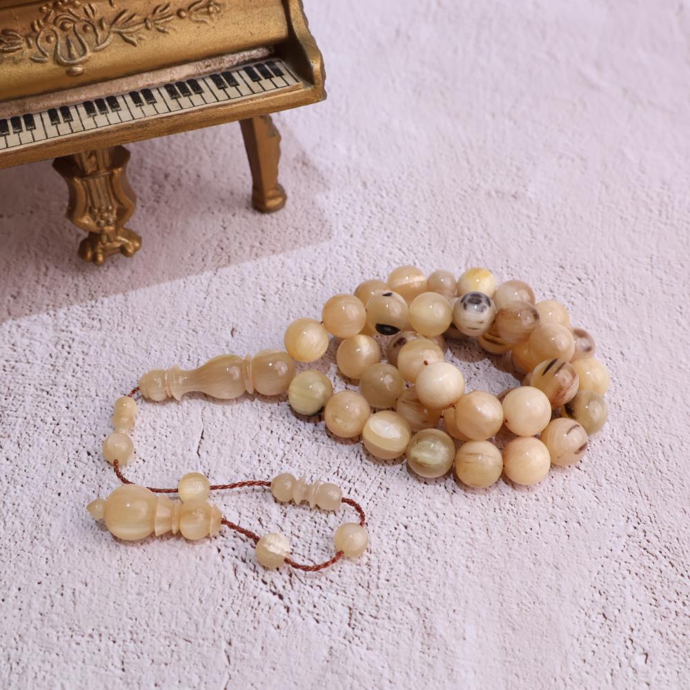 اختبر روعة الطبيعة مع هذه السبحة المصنوعة من قرن الضاني الطبيعي بلونه العاجي الفاتح، حيث تتناغم درجات اللون الكريمي والعاجي مع لمسات بنية خفيفة، ما يمنحها حضورًا دافئًا وأناقة فريدة. كل خرزة تُظهر عروقًا طبيعية متباينة، تجعل منها قطعة استثنائية لا تتكرر