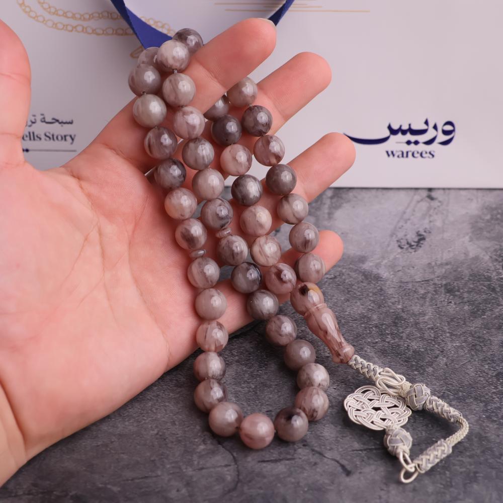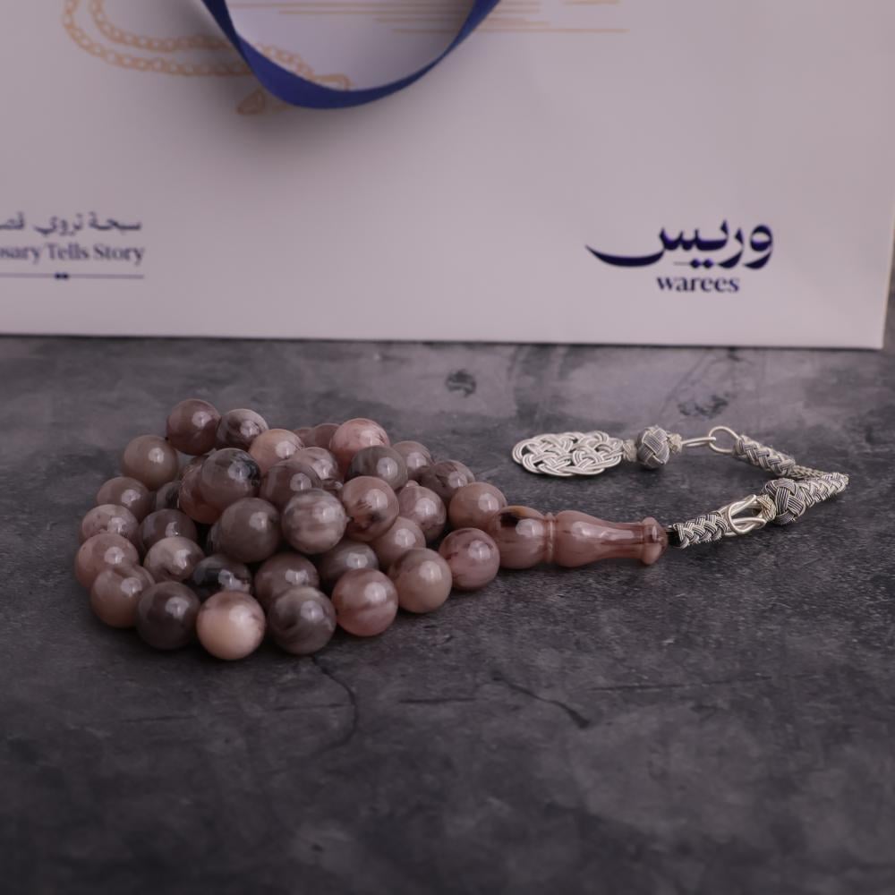سبحة مميزة مصنوعة من الفاتوران التركي الفاخر بلون كستنائي رمادي متدرج، تضفي إشراقة وأناقة فريدة لكل خرزة بفضل تفاصيلها وانعكاساتها الطبيعية.