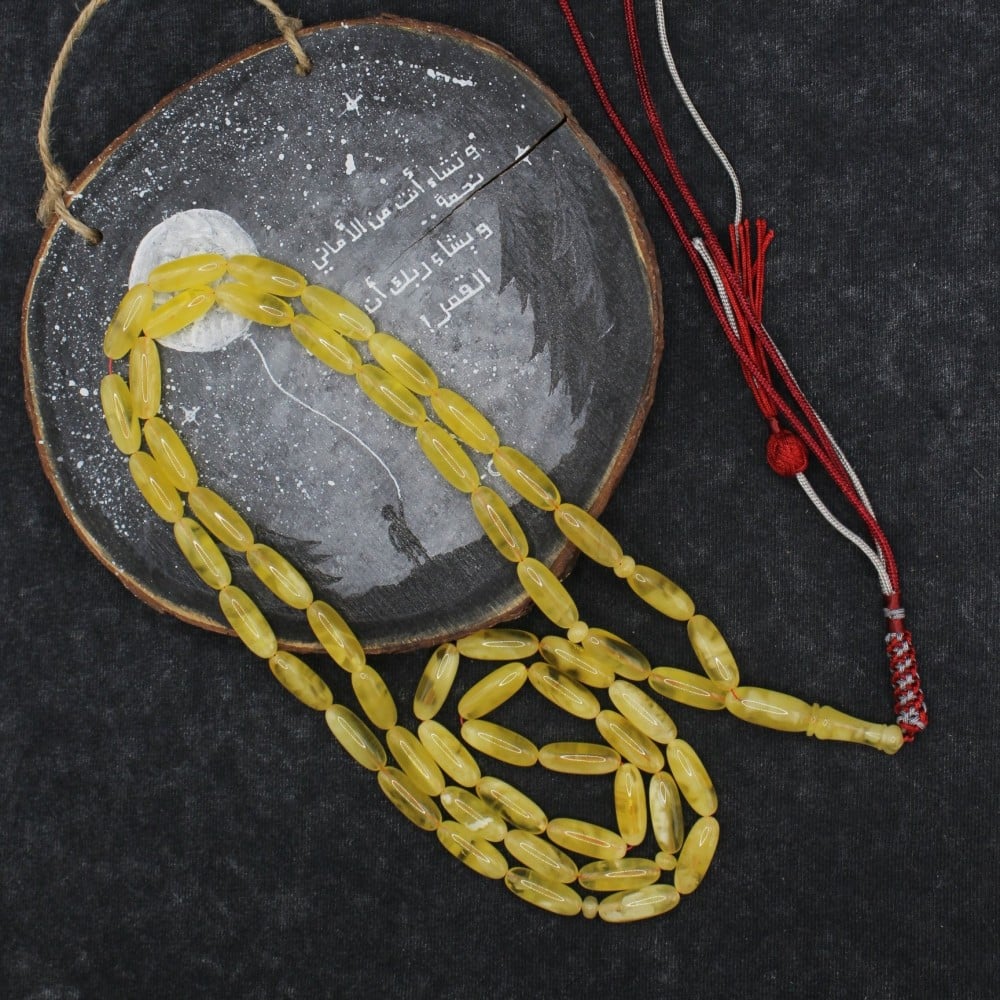سبحة من كهرمان كلينقرادي بتعجين بياض وشفافية عسلية مميزة ، نقدم هذه السبحة النادرة والفريدة من حجر فرز سوبر . تم خراطة هذه السبحة بكل حرفية و اتقان.