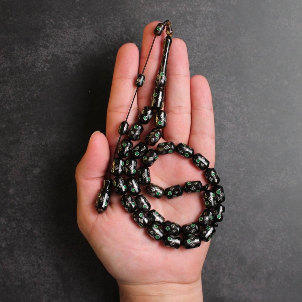 دائما ماتكون السبح الطبيعية برونق وجمال يصعب صناعته. تأتيكم سبحة من ظهر السلحفاة ( ترسه ) والمطعمه بفصوص من الزمرد الطبيعي مع نقش مميز بالفضة عيار 1000 ، خامة مميزة و ذات ملمس سحري وجذاب. تمت خراطة السبحة في مصنع الفن.