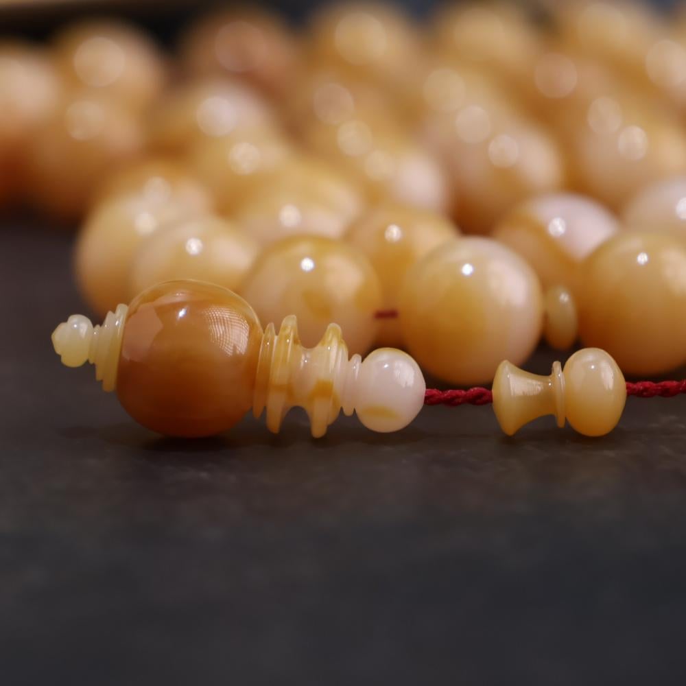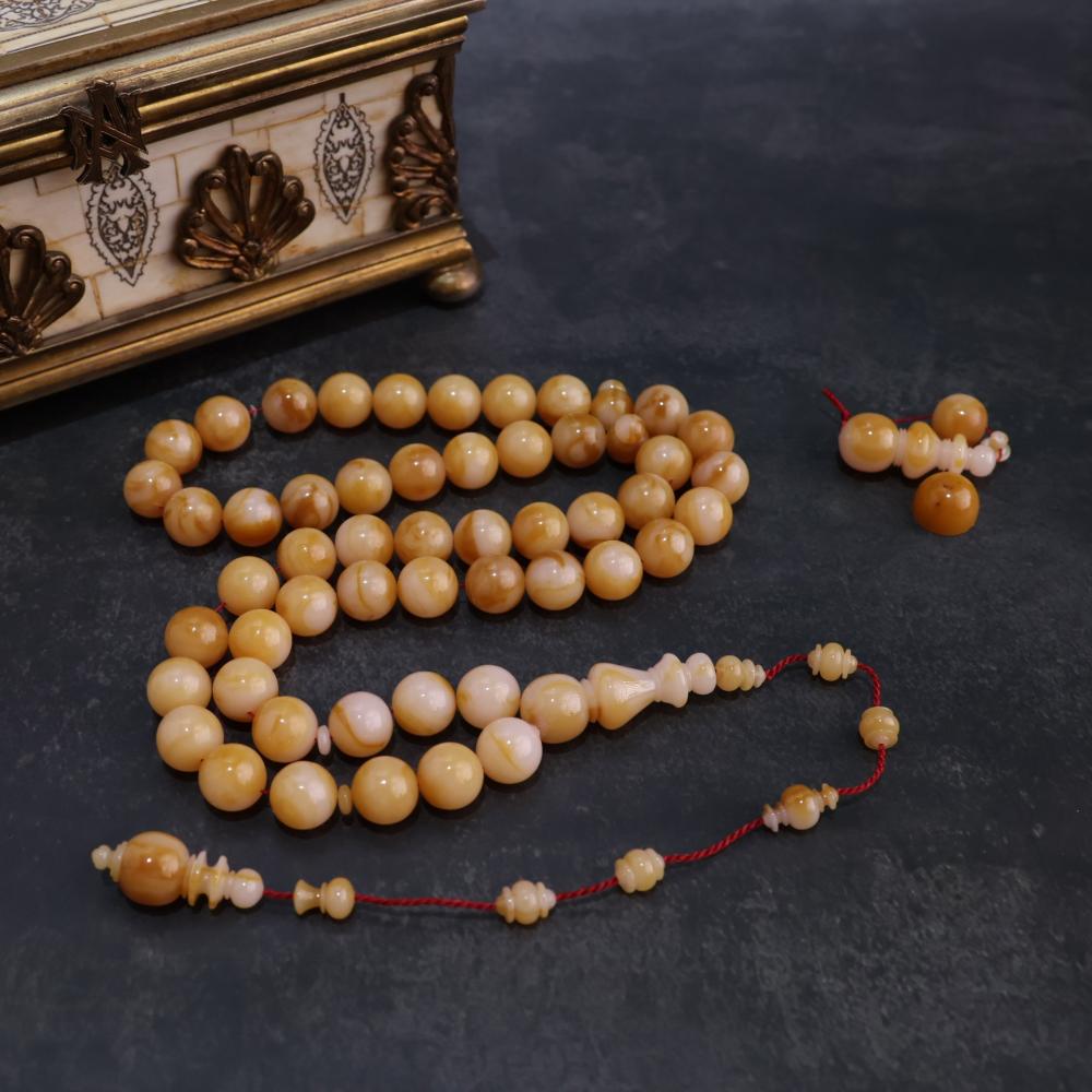 إلى عشاق الخامات القديمة نقدم لكم هذه السبحة من عصى ألمانية قديمة يتجاوز عمرها 70 سنة , لون بيج كراميل مذهب يغلف بلون كراميل غامق مميز ، تحفة فنية!